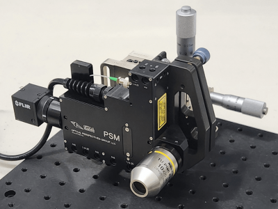The Right Angle Adapter (RAA) is an attachment that aims the axis of the PSM at right angles to the body. This is helpful when there is not enough room in a setup for the full length of the PSM body. In addition, when used with the tip/tilt mount (TTM) and no objective the PSM is an autocollimator with a sensitive angular adjustment. When used with an objective, the RAA and TTM easily adapt the PSM to a CMM as in the picture below.
