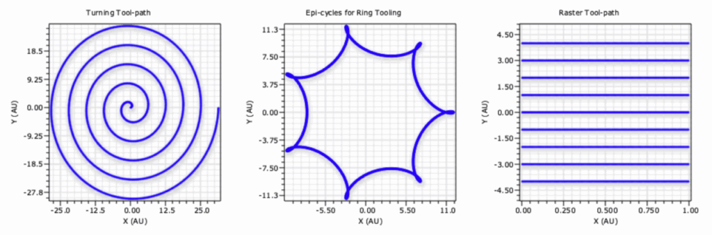 Figure 3. Sub-Aperture Tool Paths. Left. Turning tool path, Mid. Epi-cycle toolpath, Right. Raster Tool Path
