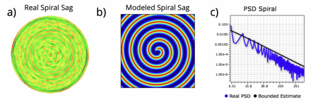 Figure 6. a) Real surface MSF sag from Aikens et. al. for spiral toolpath2b) Simulated MSF for a spiral pattern c) Simulated MSF spiral PSD