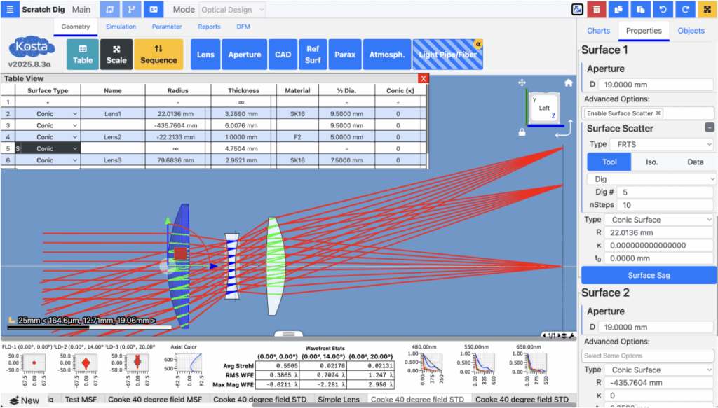 Now that we know how MSF can be modeled, we can use this information in KostaCLOUD Optical Design Software (ODS). We used KostaCLOUD Optical Design Software version 2025.8.3 to calculate tooling models for MSF tools. We used a model Cooke Triplet example to demonstrate MSF impact on image quality for tolerancing of optical systems.