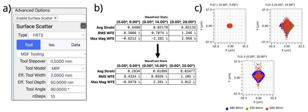 Figure 8. a) Settings in KostaCLOUD Optical Design Software (ODS) b) Wavefront statistics for nominal (top) vs MSF surface (bottom) c) Spot diagrams with MSF surface.
