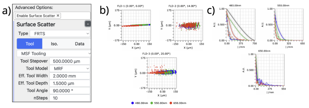 Figure 10. MSF impact for significant MSF content. a) KostaCLOUD ODS surface Scatter Settings b) Spot Diagrams with MSF contributions c) MTFs with MSF contributions
