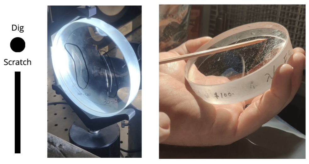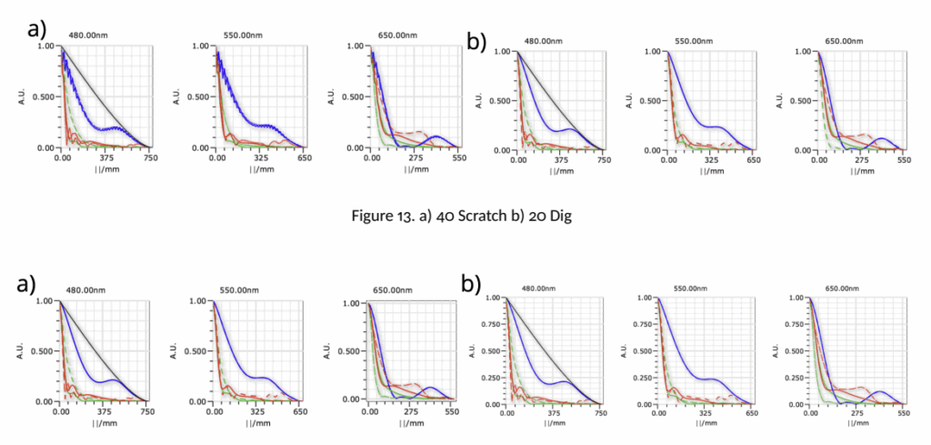 Now we will discuss a Scratch-Dig. We were interested in characterizing lots of scratches and digs to build an optical model. At Tucson Optical Research Corp., we took a scratched-up flat and various high-quality optics to quantify Scratch Dig radiometrically. After creating this database, we can then model the impact of individual scratches and digs and calculate their PSDs. We measured interferograms of each of these scratches to get the geometry information for each individual scratch in terms of width and depth. From there, we take these PSDs and put them into FRTS and calculate the scattered field.