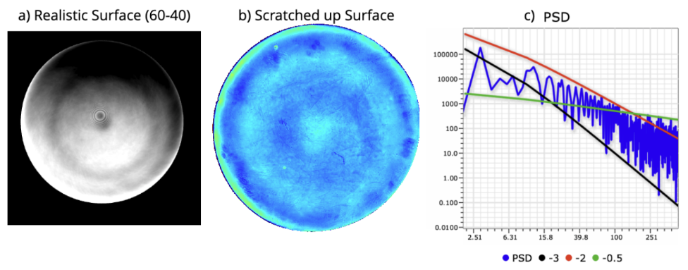 Figure 12. a) Real 60-40 surface b) Scratched up surface c) PSD of scratched up surface showing expected slopes as predicted by FRTS
